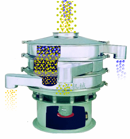 由直立式振動電機作為激振源,電機上、下兩端安裝有偏心重錘,將電機的旋轉(zhuǎn)運動轉(zhuǎn)變?yōu)樗健⒋怪?、傾斜的三次元運動,再把這個運動傳遞給篩面進行篩分。調(diào)節(jié)上、下兩端的相位角,可以改變物料在篩面上的運動軌跡。
