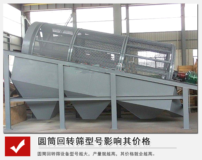 不同型號的圓筒回轉(zhuǎn)篩,其篩孔、產(chǎn)量是不同的,所以價格也會有所影響。圓筒回轉(zhuǎn)篩型號從YTS1030-YTS2060,其產(chǎn)量必然也是隨之增加的。圓筒回轉(zhuǎn)篩設(shè)備型號越大,產(chǎn)量就越高,其價格就會越高。(附參數(shù)表)