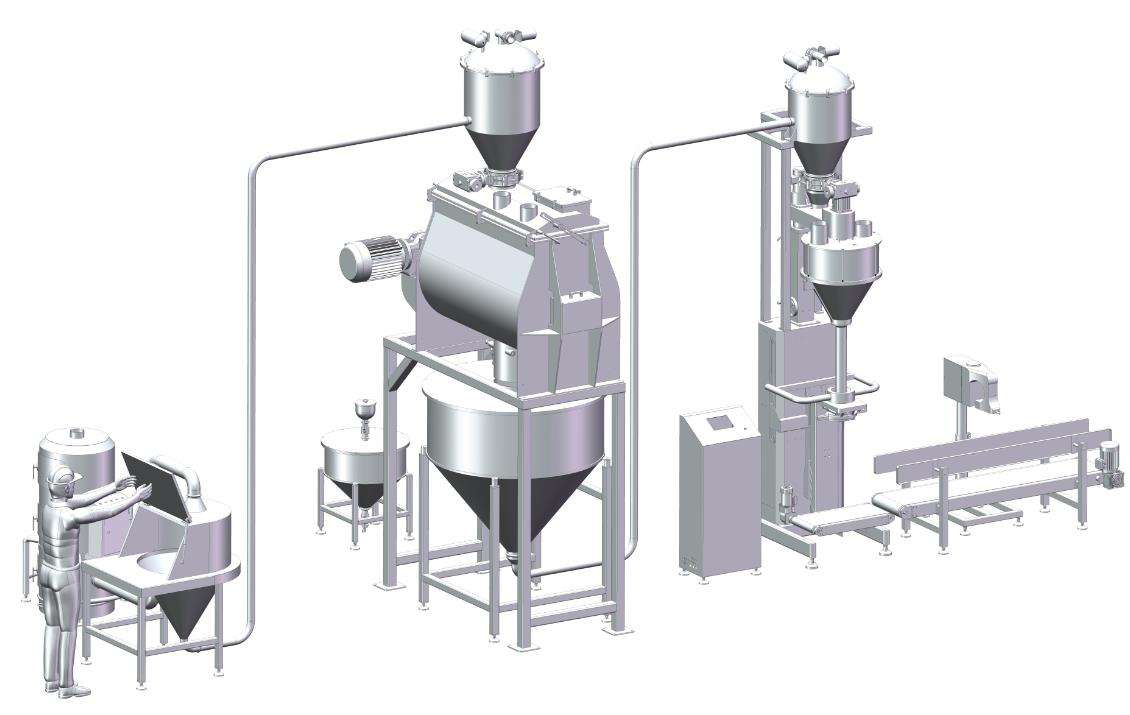 當(dāng)小袋物料需要拆包倒入下道工序時,只需人工直接拆包放入系統(tǒng)即可。給料過程中產(chǎn)生的物料粉塵由除塵風(fēng)機收集。物料通過振動篩(安全篩)攔截散狀物料和異物,保證符合要求的顆粒順利輸入。