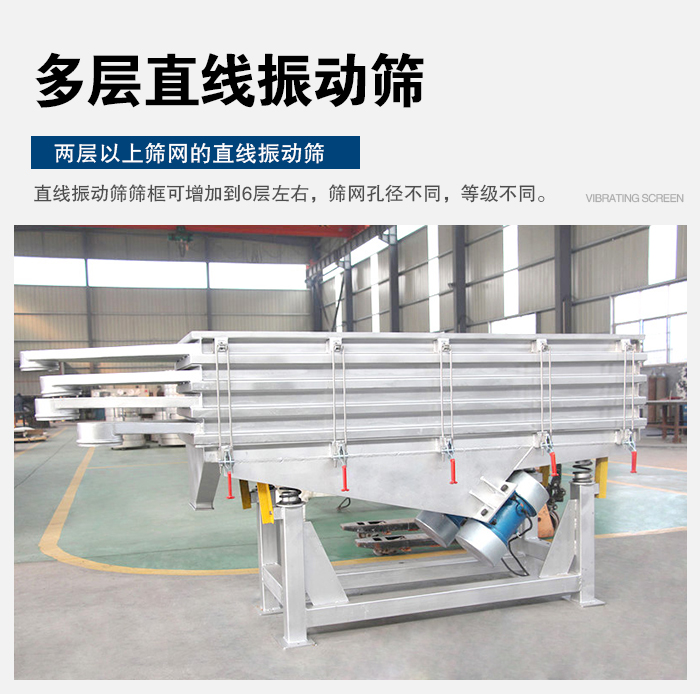 多層直線振動(dòng)篩是指:兩層以上篩網(wǎng)的直線振動(dòng)篩,直線振動(dòng)篩篩框可增加到6層左右,每層的篩網(wǎng)孔徑不同,所篩出的東西就會(huì)有不同等級(jí),因此多層的直線振動(dòng)多使用到一些有特殊要求的行業(yè)中。