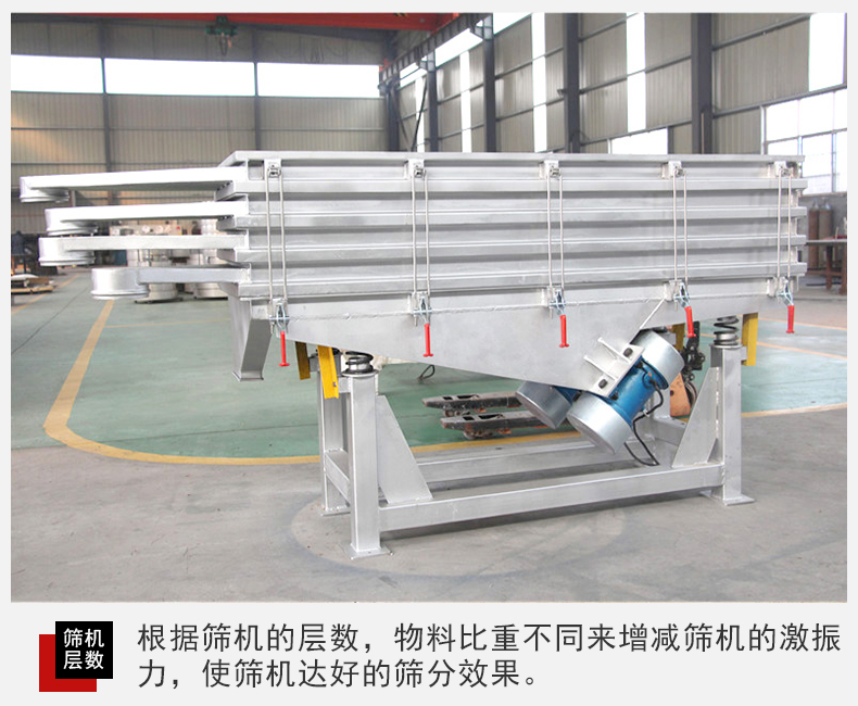 2,直線篩振動(dòng)篩篩分面積廣,該設(shè)備從粉狀篩分到顆粒狀物料篩分都能完成同時(shí)還能夠篩分多種物料等級(jí)。